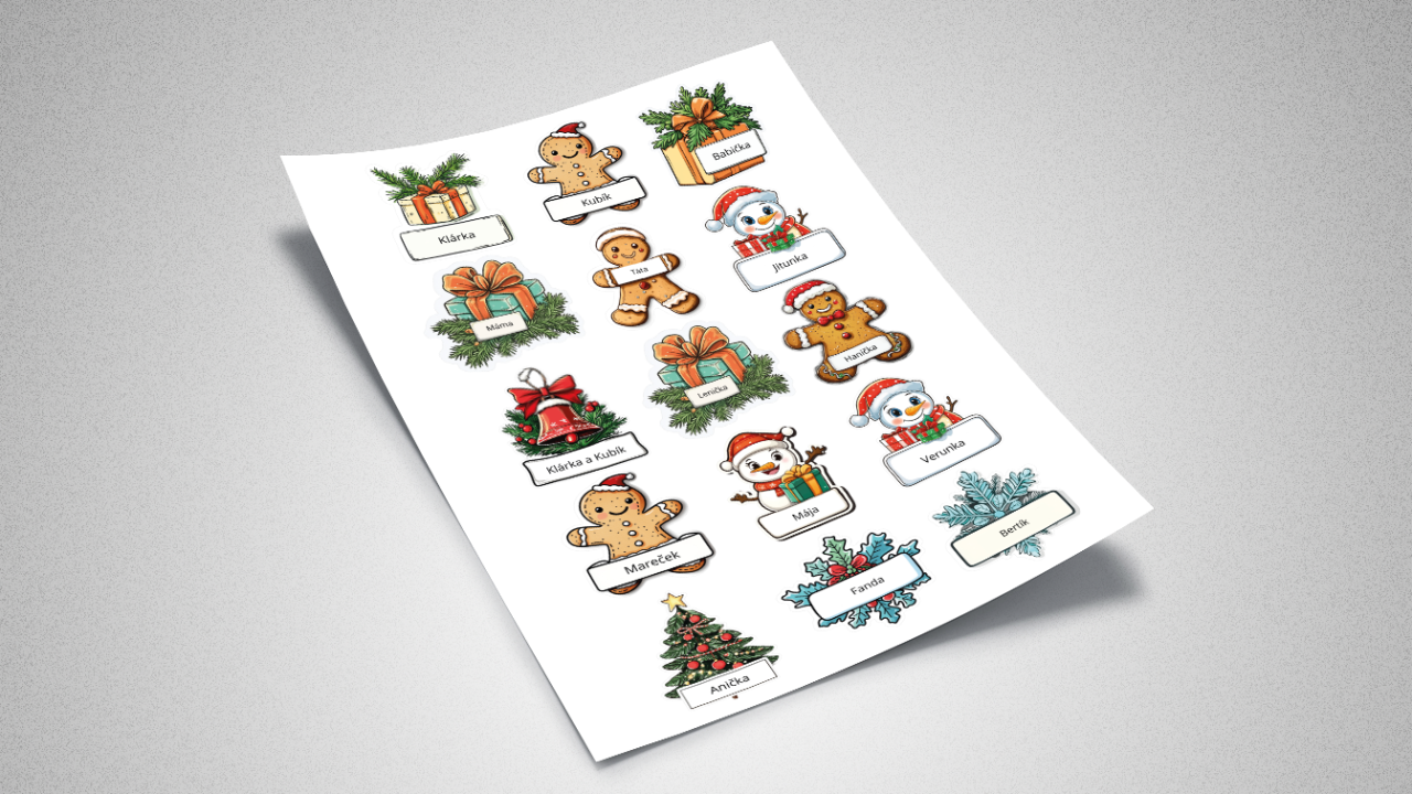 Vánoční samolepky na dárky o přibližném rozměru 85x85 mm (skutečný rozměr se může lišit v závislosti na tvaru samolepky). Možnost vložit vlastní jména. Při koupi více sad (archů) množstevní sleva již od dvou kusů.